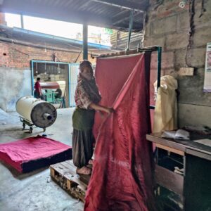 Tässä perheyrityksessä Rouva Laxmi vastaa kankaiden tuotannosta ja ompelimosta. Heille valmistui äskettäin uudet tilat ja nyt ne ovat valoisat ja työturvallisuus on otettu huomioon. On tärkeää myös, että naisilla on hyvät ja erilliset WC-tilat.