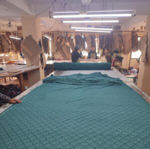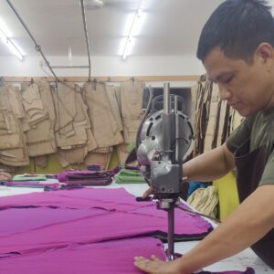 Naisia työskentelee ompelimossa ja viimeistelyssä. Miehet kaavoittavat ja leikkaavat kankaat.