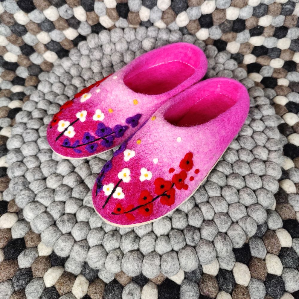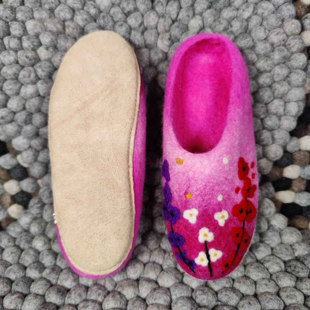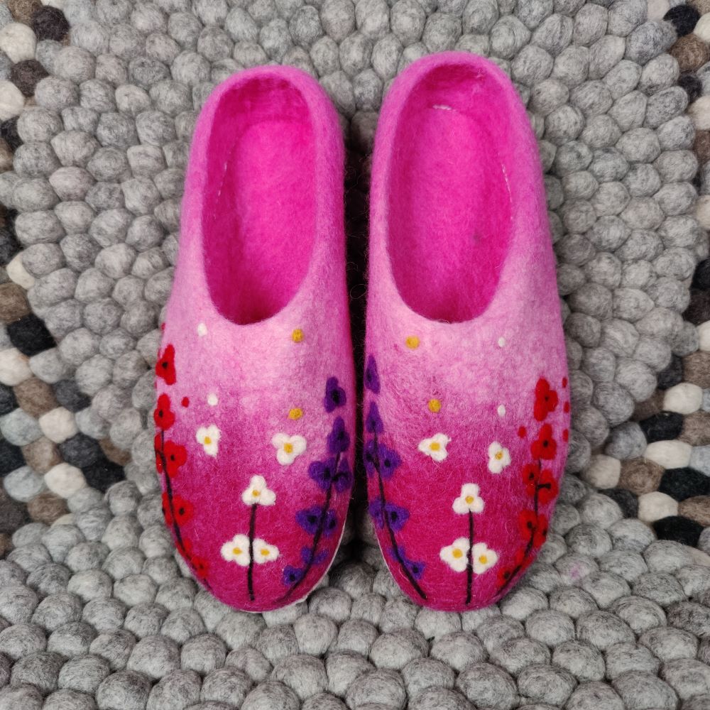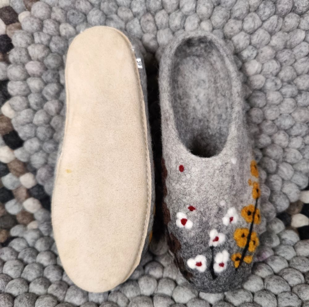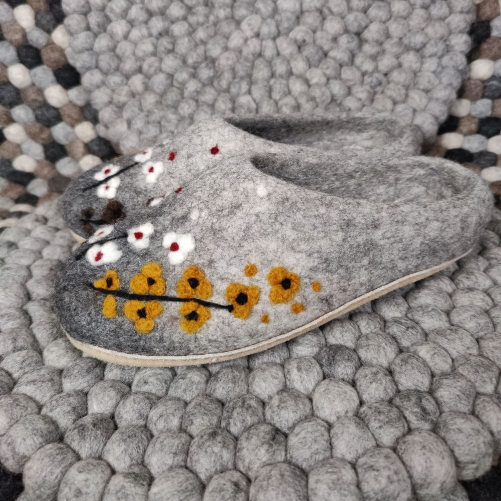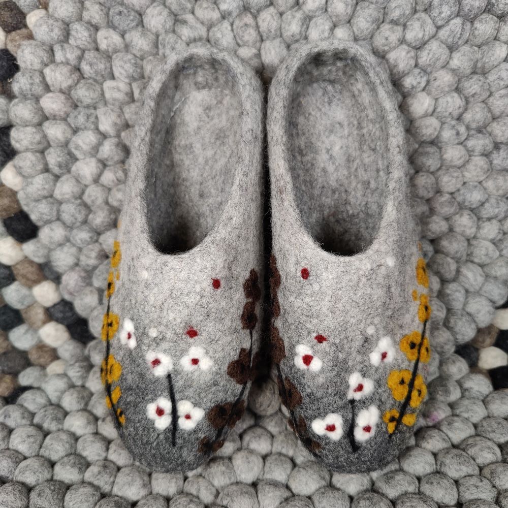 Ihastuttavat Babadum Flower Power aamutossut on huovutettu käsin 100 % lampaanvillasta ja varustettu pitävällä, mutta pehmeällä nupukkipohjalla. Avokasmallinen tossu on helppo sujauttaa jalkaan, ja se istuu hyvin, vaikka koko olisi hieman reilu.
