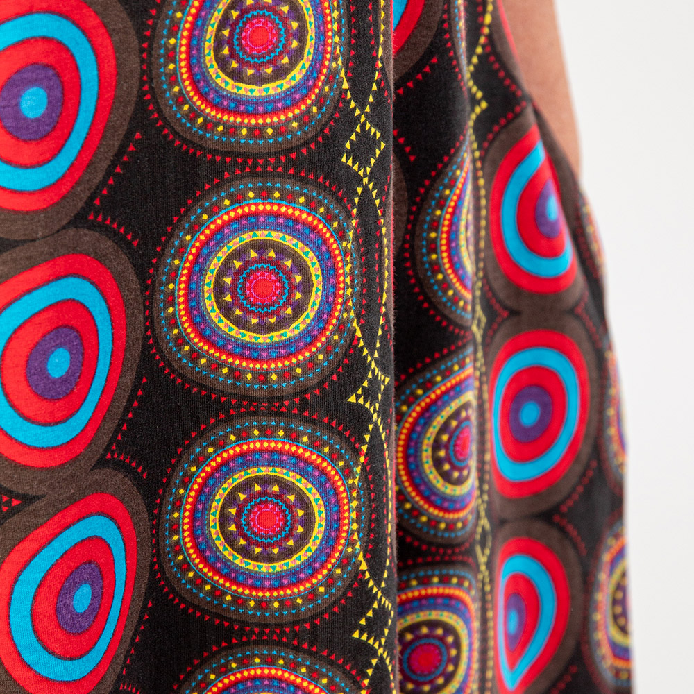 Samyami maximekossa on taskut ja se on A-linjainen. Materiaali on laadukasta 100% puuvillatrikoota, joka myös joustaa hieman. Kaksi väriä toisessa on punainen pohjaväri ja toisessa musta.