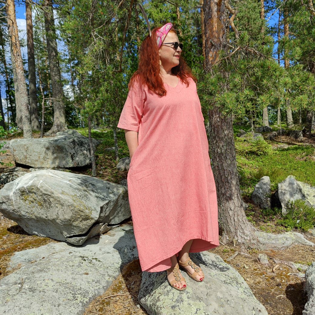 Lohenpunainen Tanya kaftaani on 100% puuvilla ja siinä on taskut. Reilu mitoitus vapauttaa. Takaa pidempi kuin edestä, V-pääntie. Teija kuvassa on 163 cm pitkä ja hänen rinnanleveytensä on 54 cm, paino 75 kg ja hänellä on koko L-XL. Mitoitus on siis reilu.