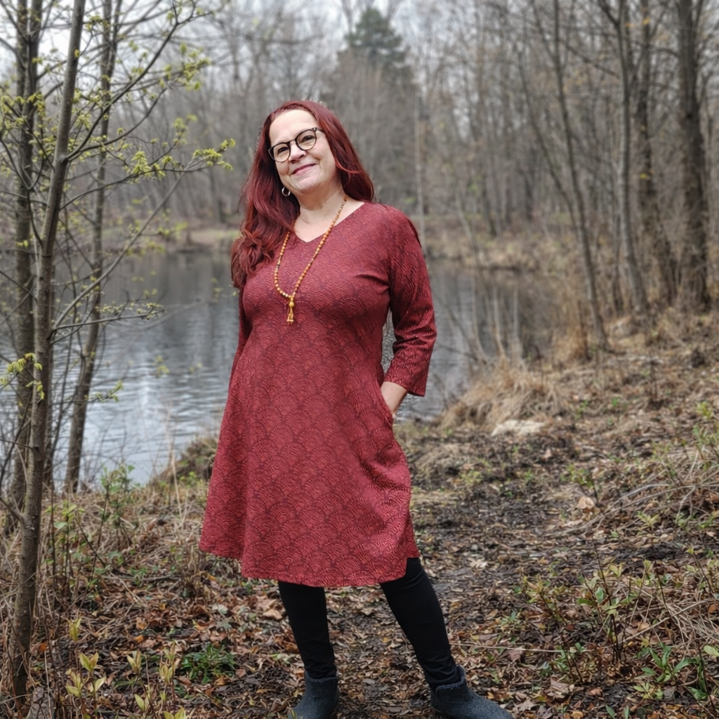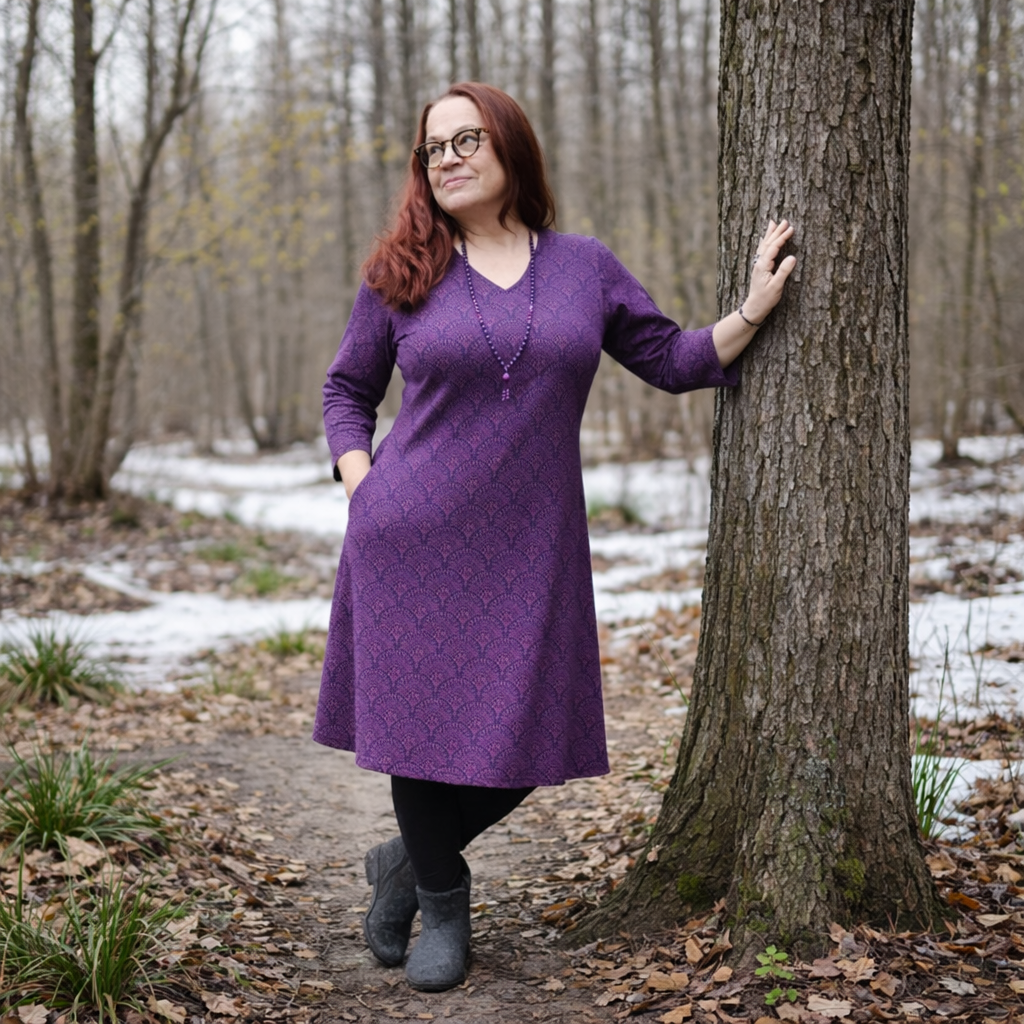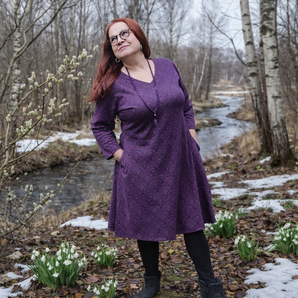 Taskumekko/tunika Darsana on 100% luomupuuvillatrikoota. 3/4 hihat, taskut ja polvimitta. Kaunis viuhkaprintti ja kaksi kaunista väriä burgundi-oranssi ja violetti-tiilenpunainen. Koot S-3XL.